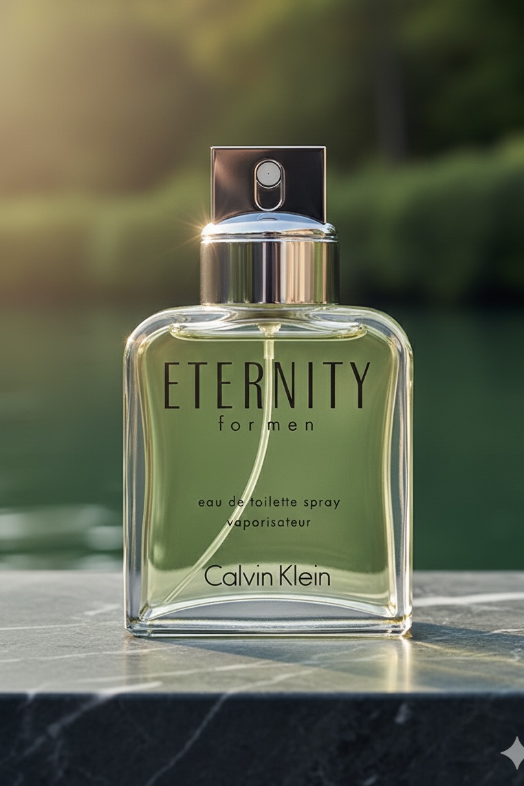Calvin Klein Eternity for Men Eau De Toilette – an Aromatic Fougere fragrance launched in 1990. Top notes are lavender, lemon, bergamot, and mandarin; heart notes are sage, jasmine, and lilies, adding a fresh and herbal character; base notes are sandalwood, musk, vetiver, and amber for a warm, long-lasting finish.