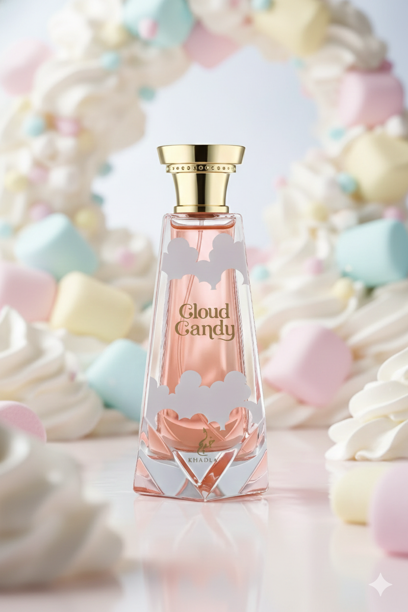Khadlaj Cloud Candy Eau de Parfum – a delightful unisex gourmand fragrance launched in 2025. It opens with juicy strawberry and tangerine, flows into a creamy heart of marshmallow, coconut, and whipped cream, and settles into a sweet, long-lasting base of vanilla, sugar, white musk, and ambroxan for a playful, dessert-inspired aroma.