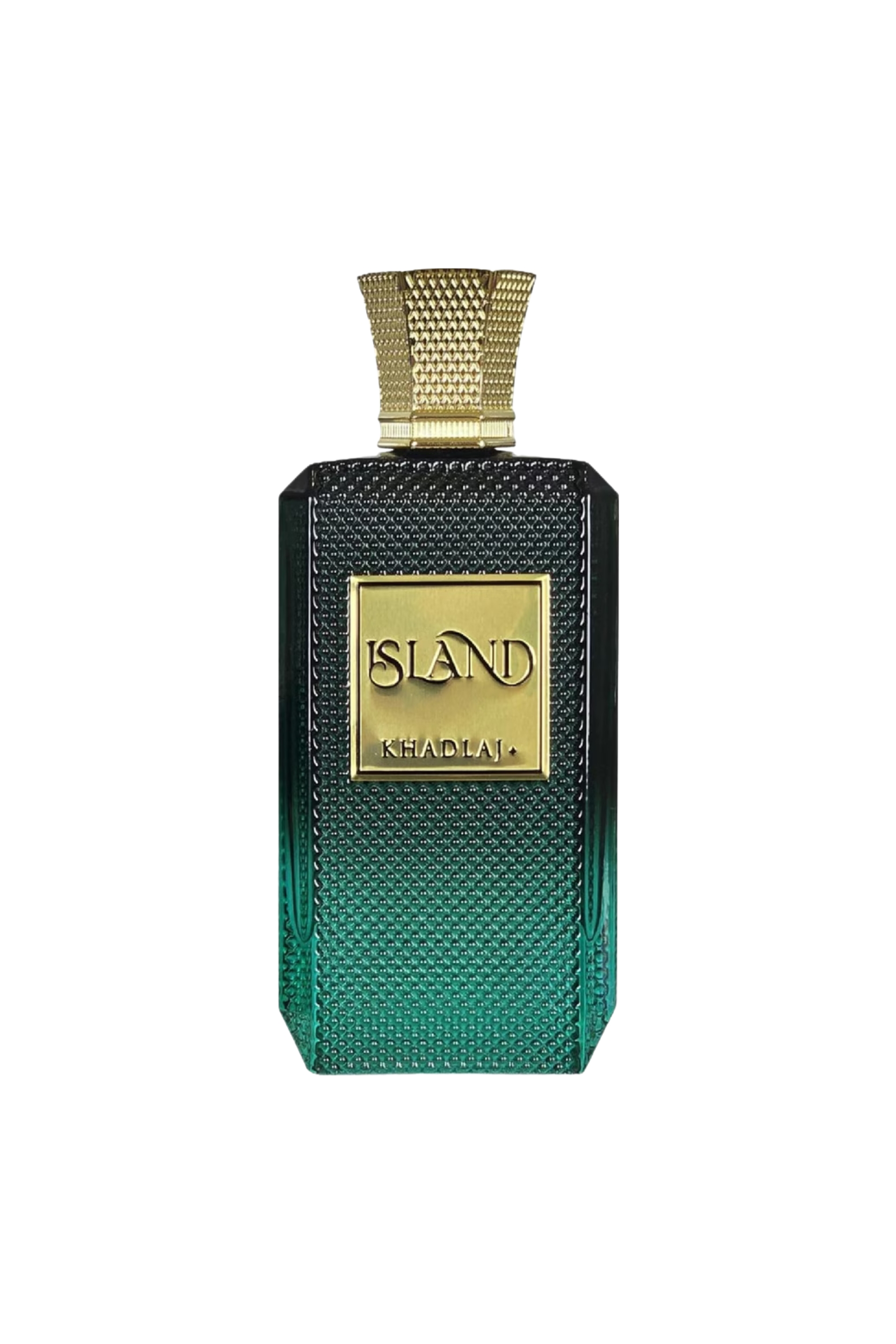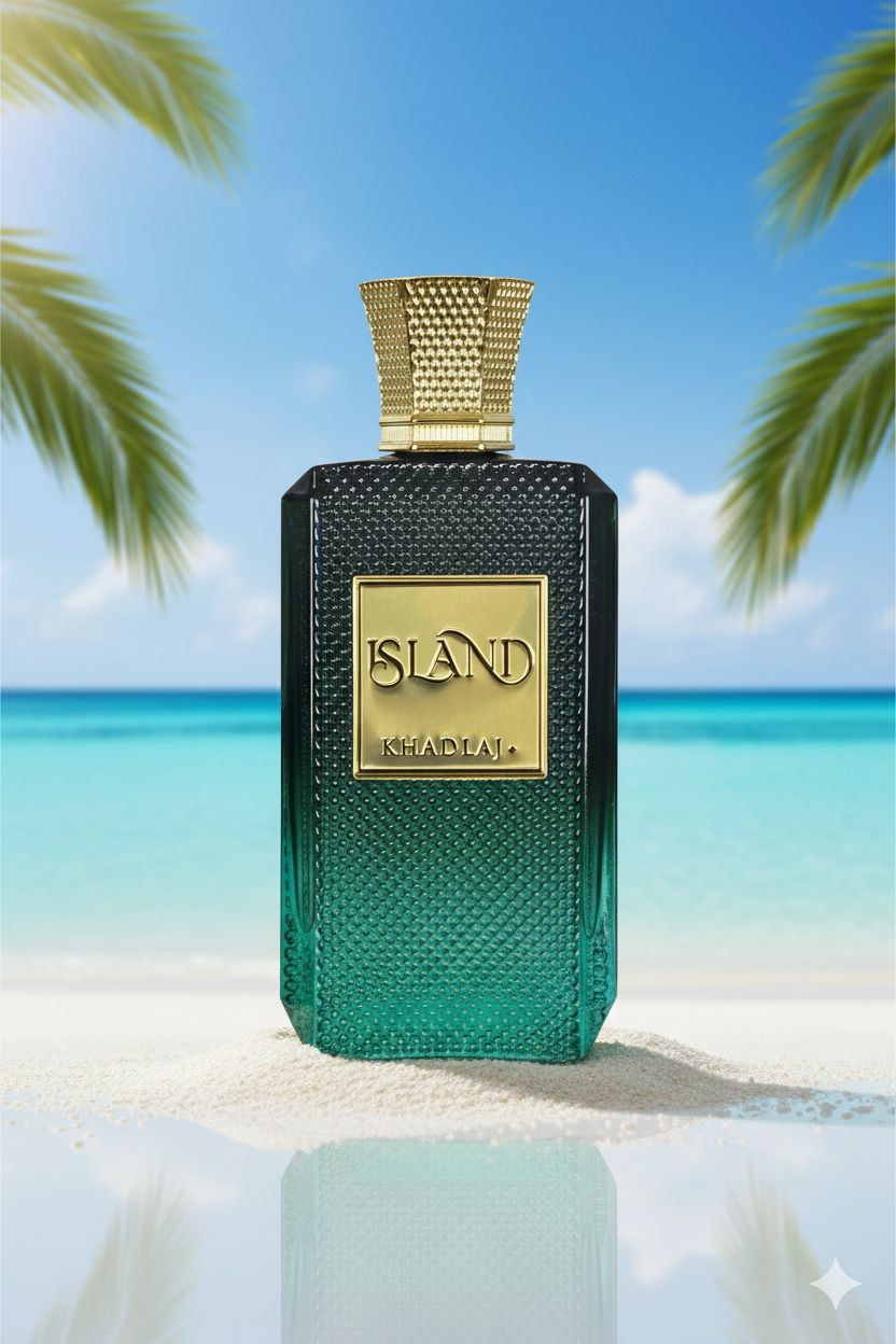 Khadlaj Island Eau de Parfum – a fresh and exotic fragrance for women and men, launched in 2024. It opens with vibrant pineapple, iris, ginger, and cypress, flows into a tropical heart of coconut and woody notes, and settles into a warm, long-lasting base of tonka, sandalwood, amber, and ambergris.