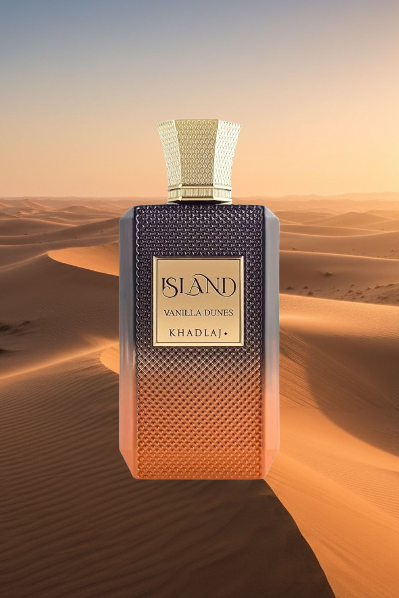 Khadlaj Island Vanilla Dunes Extrait De Parfum – A warm, enchanting blend of Cinnamon, Vanilla, and Cardamom with hints of Orange Blossom and Bourbon. Finished with Praline, Amber, and Musk, Island Vanilla Dunes evokes cozy luxury and sunlit sophistication.