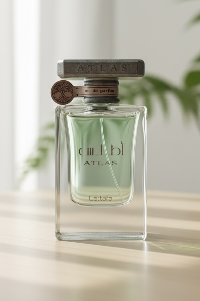 Lattafa Atlas Eau De Parfum – a unisex fragrance launched in 2024. It opens with Sea Notes, Salt, and Lemon, moves into Davana and Iris, and settles into a smooth base of Ambergris, Oakmoss, and Sandalwood for a fresh, calm, and refined finish.