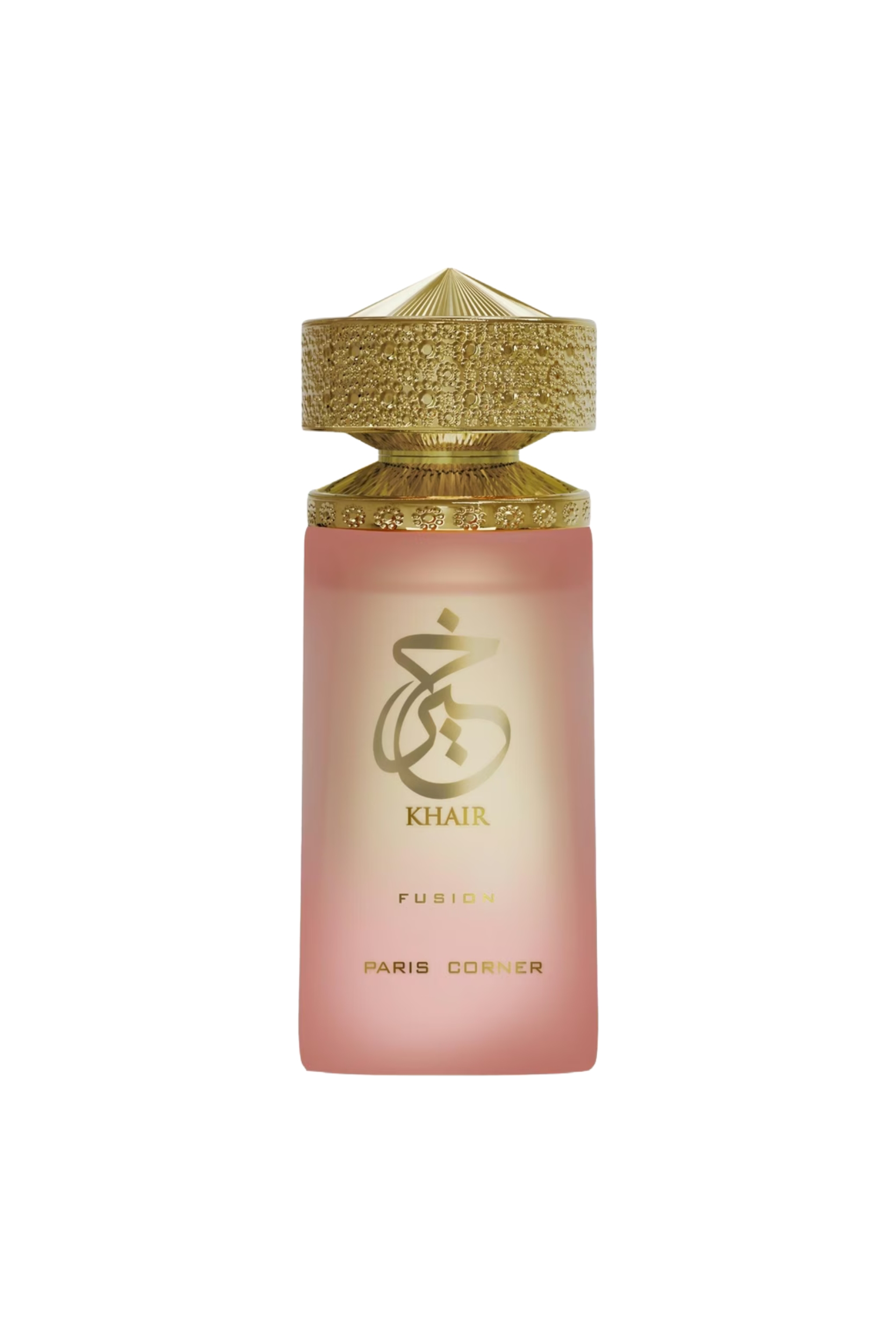 Paris Corner Khair Fusion Eau de Parfum – a vibrant unisex scent blending juicy fruits, elegant florals, and a warm, creamy base of vanilla, musk, sandalwood, and cedar.
