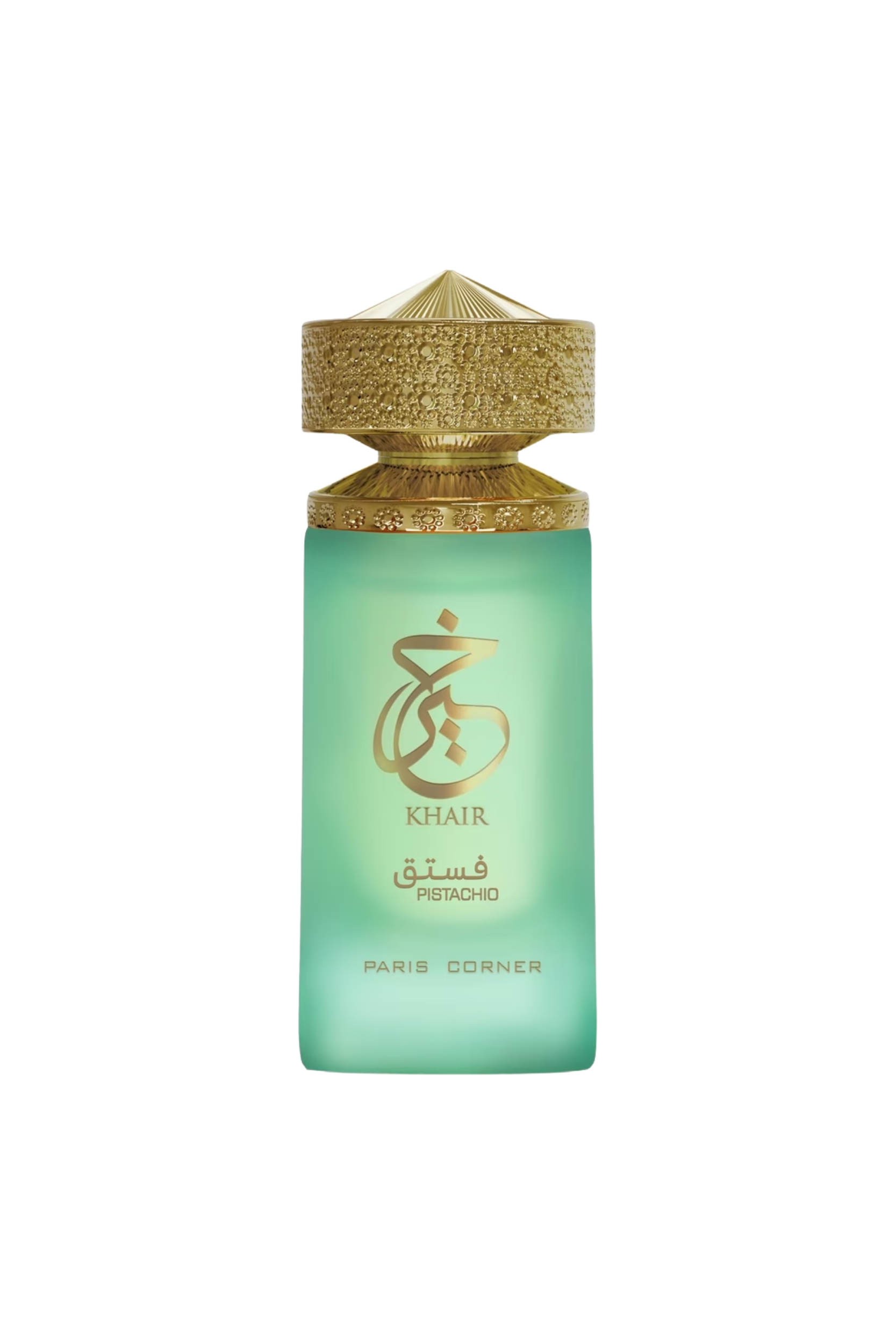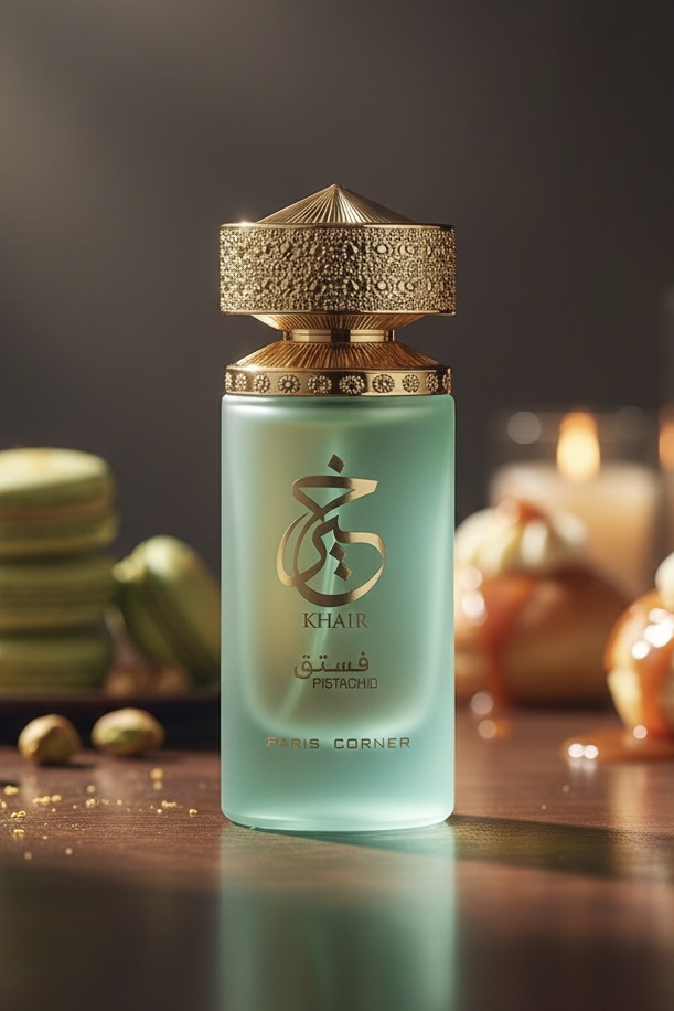 Paris Corner Khair Pistachio Eau de Parfum – a rich unisex gourmand fragrance, opening with creamy pistachio, ice cream, and warm spices, evolving into fruity florals, and finishing with whipped cream, marshmallow, and soft woods.