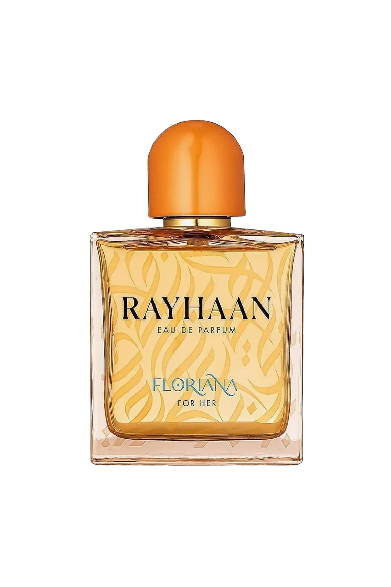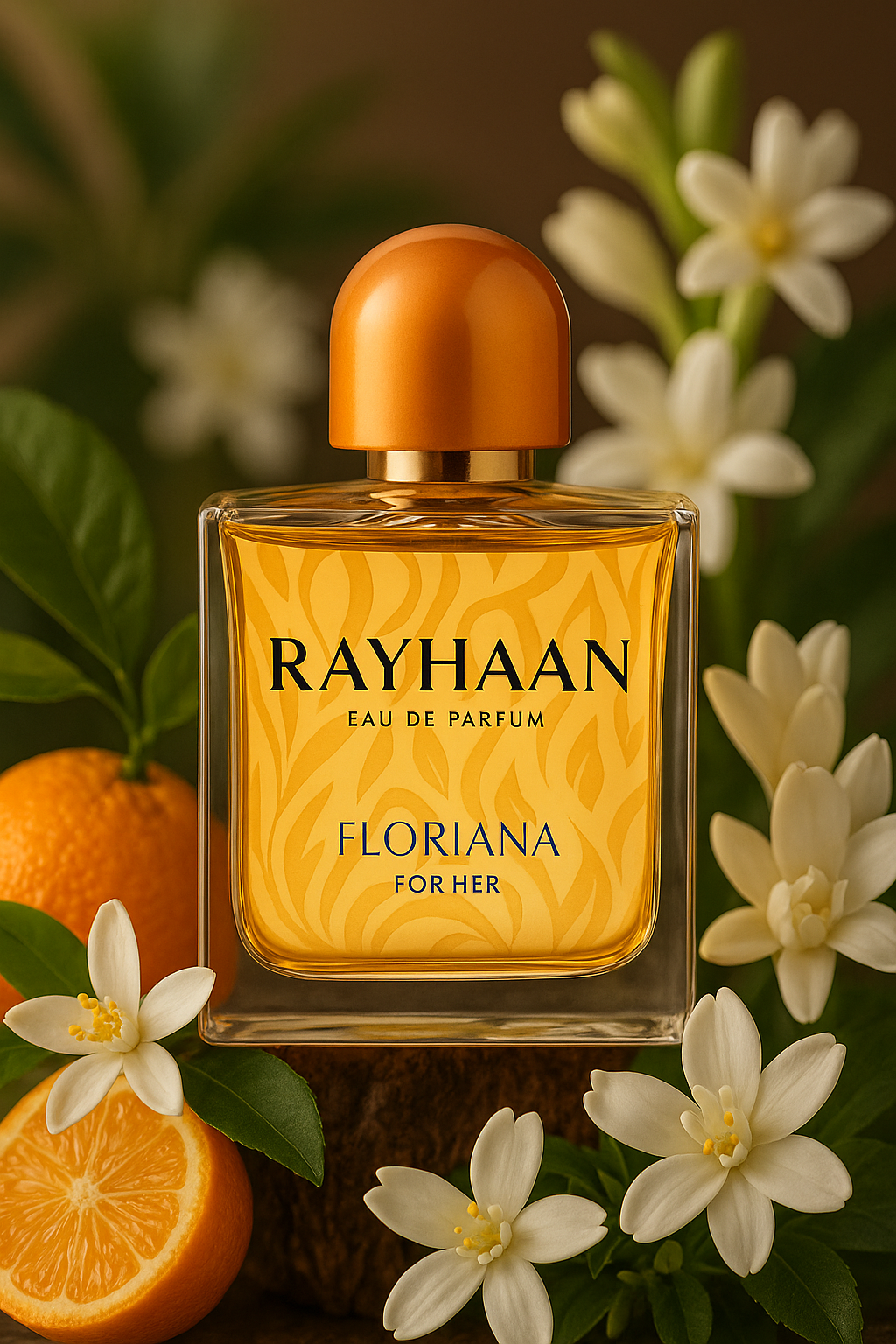 Rayhaan Floriana Eau De Parfum – a refined women’s fragrance that blends fresh orange blossom and bergamot with the sensual warmth of jasmine and amberwood. Soft notes of vanilla, white musk, and cedar create a delicate, feminine finish full of grace and energy.