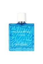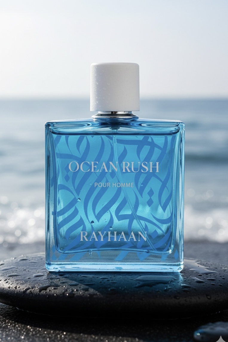 Rayhaan Ocean Rush Eau De Parfum – an Aromatic Aquatic fragrance for men, launched in 2022. It opens with cascalone, bergamot, green mandarin, and aquozone, followed by a heart of rosemary, cypress, and lavender, and settles into a base of musk, patchouli, and amber for a fresh, invigorating, and long-lasting scent.