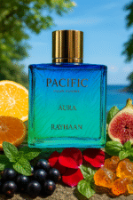 Rayhaan Pacific Aura Eau De Parfum – captures the freshness of a coastal breeze with a vibrant summer touch. It opens with a bright burst of mint, citrus, and black currant, followed by a heart of apricot, basil, and may rose. The base of fig, dates, and ambrette adds a soft, elegant warmth — a refreshing fragrance that feels like sunlight over calm ocean waves.